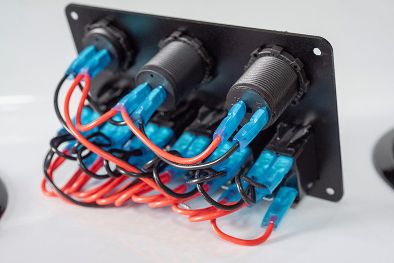 In addition to housing a half-dozer rocker switches, this panel also includes a handy dual-port USB socket and a cigarette lighter socket that can be used with 12V plug-in accessories. There’s also volt meter, which allows you to keep an eye on battery status.