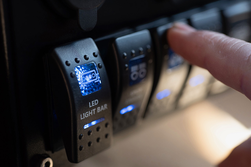 A rocker switch panel for your adventure vehicle conveniently and aesthetically controls all your necessary vehicle enhancements