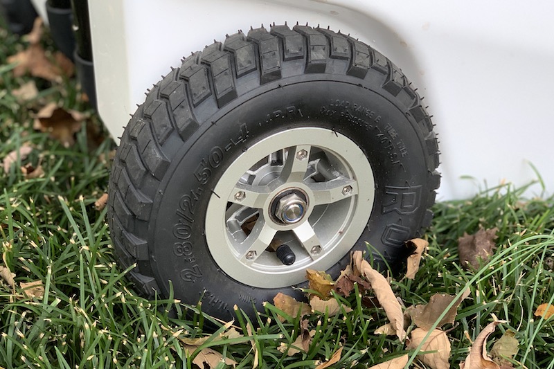 Using real pneumatic tires means you get fast rolling and quick maneuvering cooler that also has a lot of shock-absorbing capabilities that can easily handle bumpy trails knotted with roots or rutted asphalt. I found that they work especially well when shooting down a short set of concrete patio stairs—you can quickly take a loaded cooler down them without having to worry about cracked plastic or breaking anything inside or out.