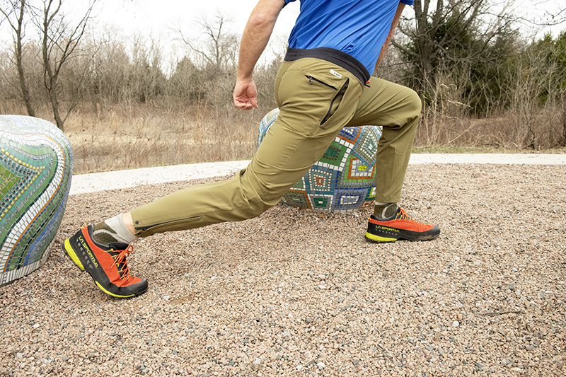 The Reflex fabric was developed as an activewear option with abrasion resistance and a more athletic fit. The tapered ankle with zipper and button closure is designed to fit snugly over hiking boots or tennis shoes. I have found the pants comfortable and flexible enough to ride my mountain bike or play a pickup game of basketball. They are a stylish and technical step up from your sweatpants or joggers.