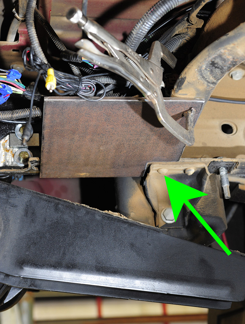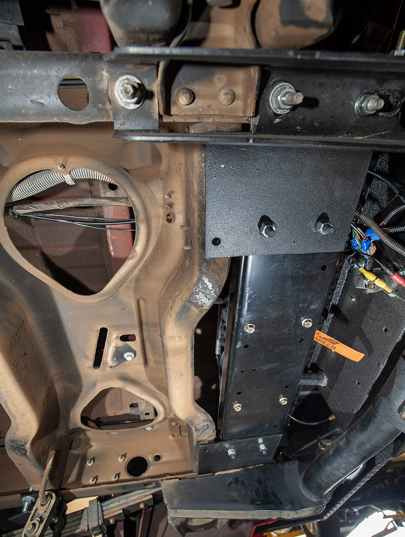 That allowed us to easily attach two 9x9x1/4-inch steel plates that serve as the extension brackets to hang the universal mount between the frame rails and the spare tire hanger crossmember. The plates are eventually bolted (sandwiched) between the factory hitch mounts and the truck’s frame rails.