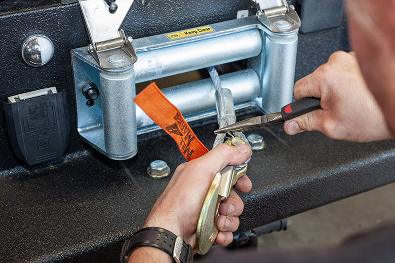 Mount fairlead. Mount flip-up license plate holder. Run winch cable through fairlead and install hook. Double-check that all mounting hardware is tight and electrical connections are secure.